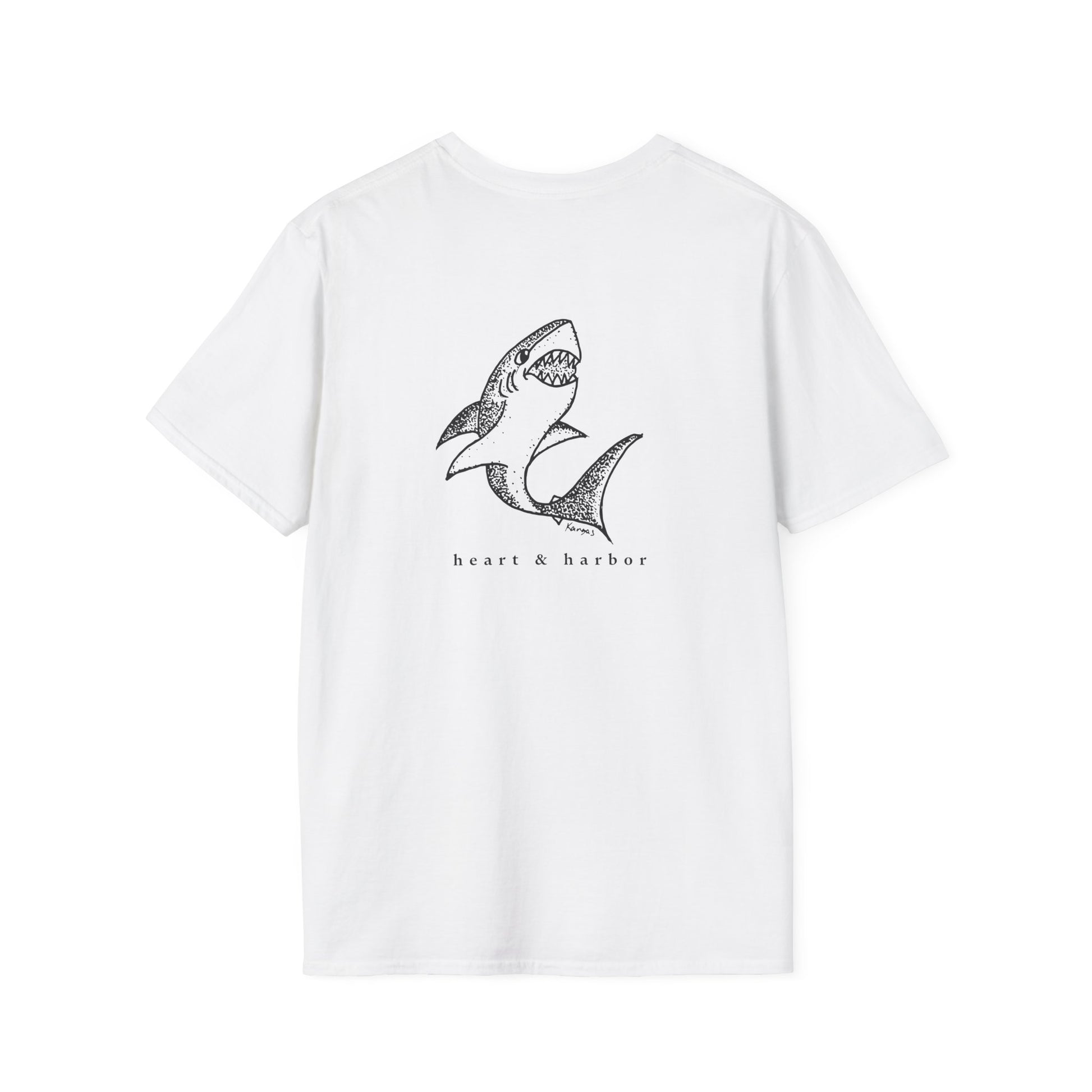 Bold Back Graphic: A large, hand-illustrated shark design in a unique stipple art style.